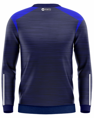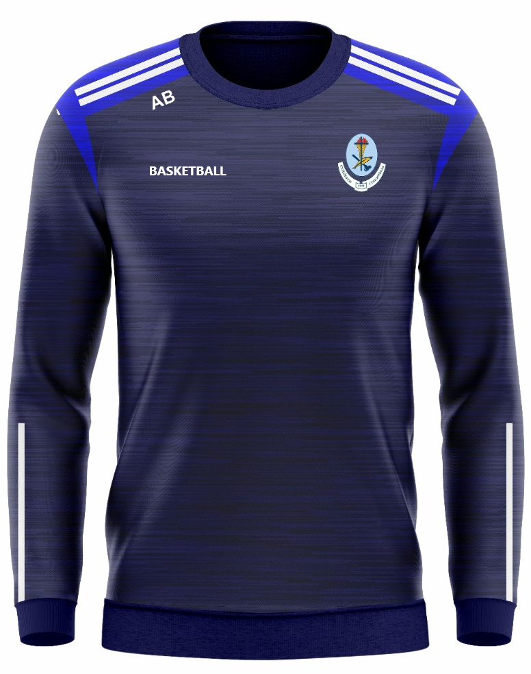 This is the sweatshirt for the Colaiste Chraoibhín basketball teams, the body is melanga navy in color and the shoulders are royal blue with white stripes